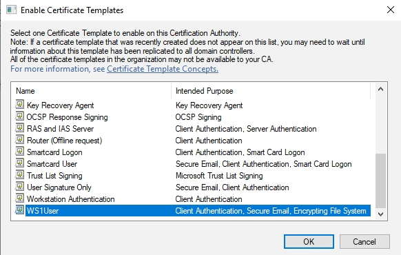 - Select the newly created Certificate Authority and Certificate Template