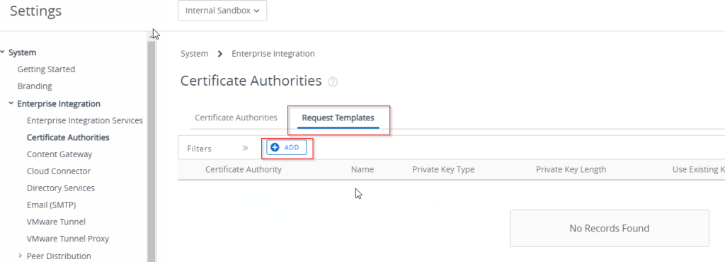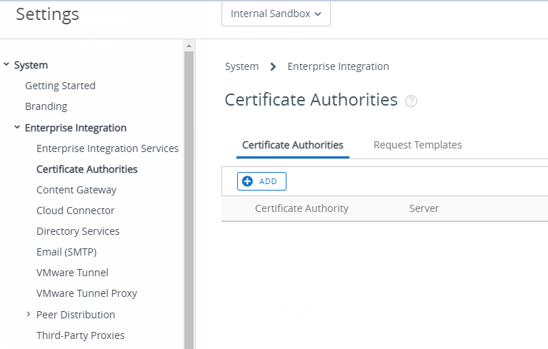Next, go to Settings, Enterprise Integration, Certificate Authorities. Add a new Certificate Authority.