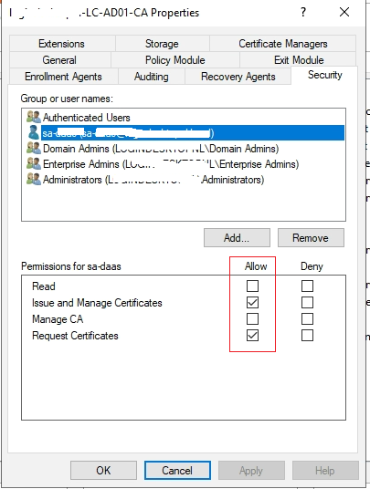 Right-click the Certificate Authority, and choose Properties. Give a service-account, which you will use later for the Workspace ONE UEM configuration, allow permission for Read and Enroll.