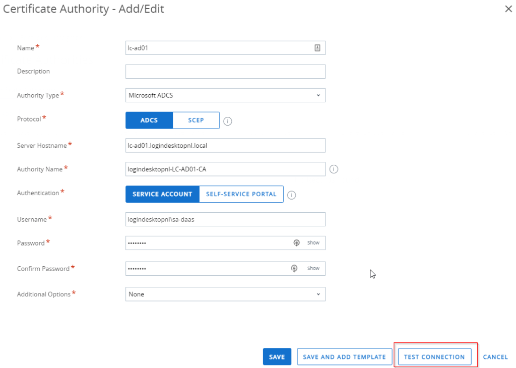 Next, fill in the service account we have configured with read and enroll permission in ADCS and click TEST CONNECTION.