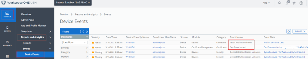 We can also verify this in the Monitor -> Reports and Analytics -> Device Events menu.