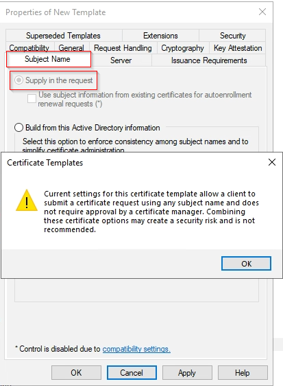 Click the tab Subject Name, and choose the option Supply in the request. We are going to configure these settings in Workspace ONE UEM.