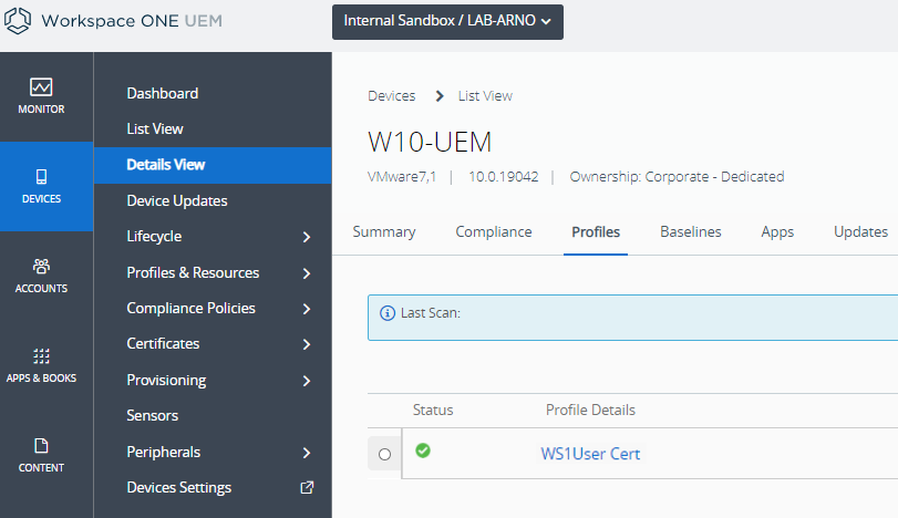 To verify if the certificate is correctly installed, click the Devices -> List View menu and select the device. In the tab Profiles I can see my user certificate is not yet installed. We can force this by selecting the Profile and click the Install button.