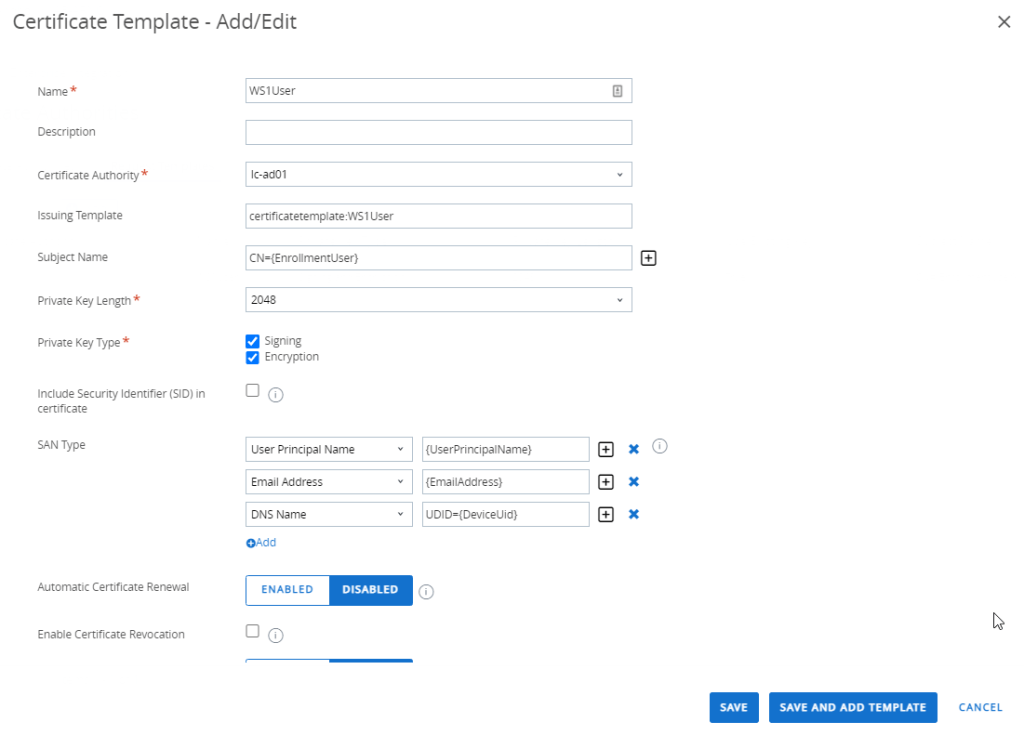 - Issuing Template = certificatetemplate:<name of the user certificate template we’ve created earlier>