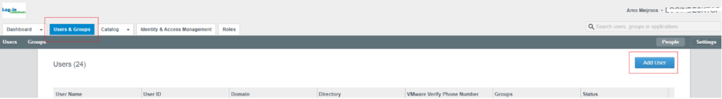 In the Workspace ONE Access Admin Console, open the Users & Groups tab and click on the “Add User” button.
