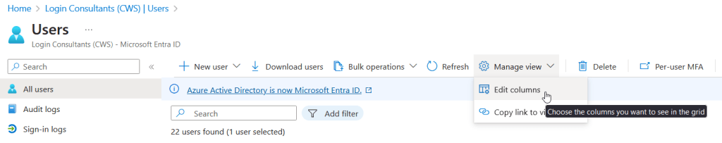 So, this all was correctly configured. Now we wanted to see if this Immutable ID value for a test user is actually matching. At first, we checked Entra ID. You can see the Immutable ID value if you manage the view for the Entra ID users and add “On-premises immutable ID”.