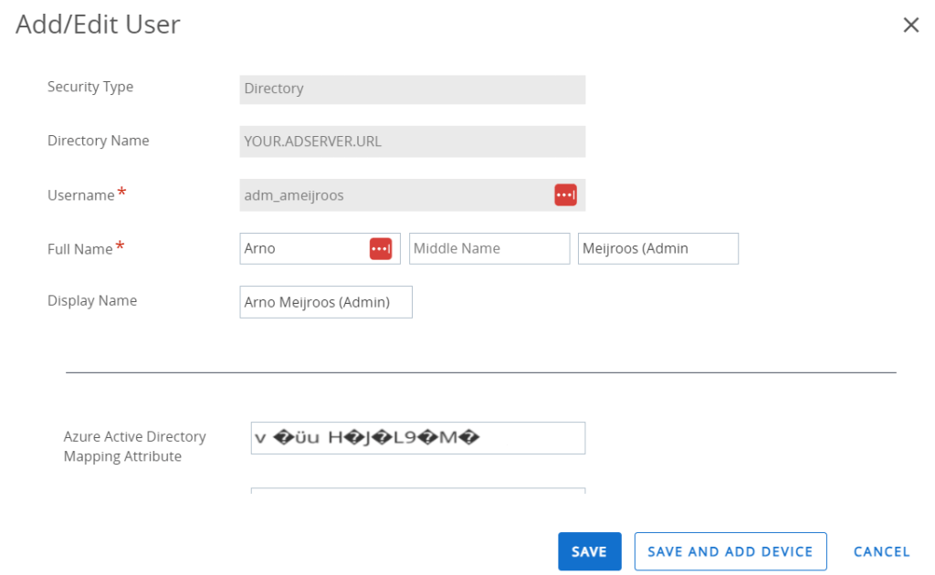 Okay, now we have the GUID, let’s see if this matches what we see in Workspace ONE UEM by editing one of the users. In there, we noticed the Azure Active Directory Mapping attribute was some kind of strange unreadable value!